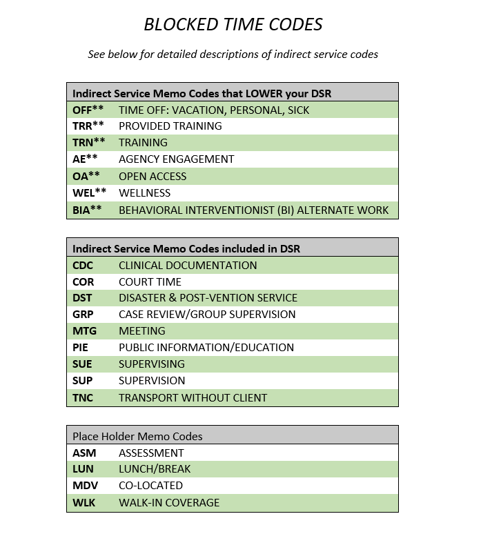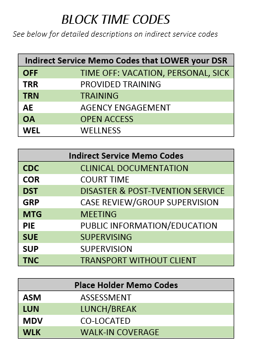 Accounting for indirect service time with blocked time codes.